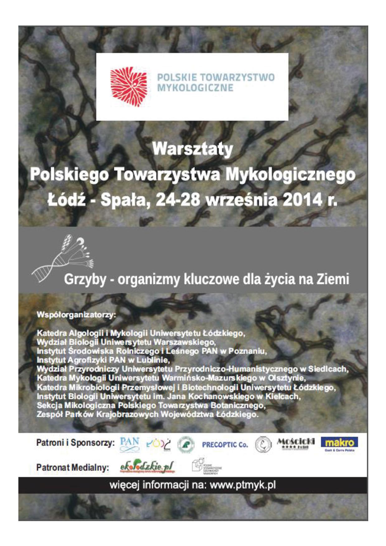 Pierwsze Warsztaty Polskiego Towarzystwa Mykologicznego pt. Grzyby – organizmy kluczowe dla życia na ziemi odbędą się w Łodzi i Spale w dniach 24 – 28 września 2014 roku.